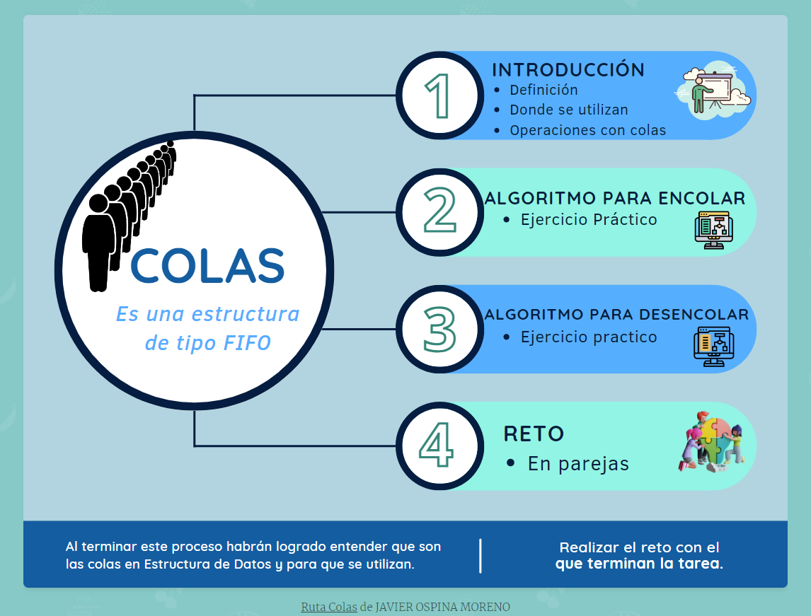 Una cola es una lista ordenada en la cual las operaciones de inserción se efectúan en un extremo llamado último y las operaciones de borrado se efectúan en el otro extremo llamado primero. Es una estructura FIFO (First Input First Output) primero en entrar primero en salir.